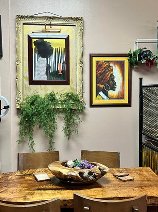 The Orgen D’nal owners spared no expense in getting their dining room up to par. The space is inviting and comfortable, complemented by lush outdoor seating on their “Back to Eden” patio, which White noted is the perfect place to enjoy Sunday brunch. “We definitely focused on art first,” he said. The space is furnished with framed paintings by Sherelle White (Lakeland, FL), Kwaku Ntow (Ghana), and Uzo Njoku (Lagos, Nigeria). Partitioned areas with couches and monkeypod wood coffee tables flank the entrance. As you walk in, the eye is captivated by a large mural of a beautiful woman crowned with a flower and foliage afro wearing an earring with the Orgen D’nal emblem. Their tables, crafted out of cypress and maple trees by a retired veteran, have a small butterfly carved into each one. “We wanted somewhere that you feel at home – you feel relaxed when you come in,” White said. Even the music – a curated playlist of lo-fi, jazz, and reggae – plays a role in creating that ambiance.